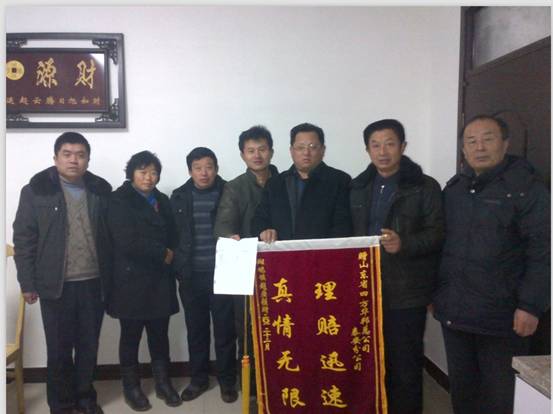 李女士于2012年11月份因肺癌病逝于家中。李女士的家人將資料準備齊全后,于2012年11月27日交給保險公司。保險公司經(jīng)調(diào)查無疑后,于2012年12月24日結(jié)案,給予理賠5.3萬元。李女士的家人對我們的服務非常滿意。他們?yōu)楸硎靖兄x,于2012年12月28日給我們公司送來了一面錦旗