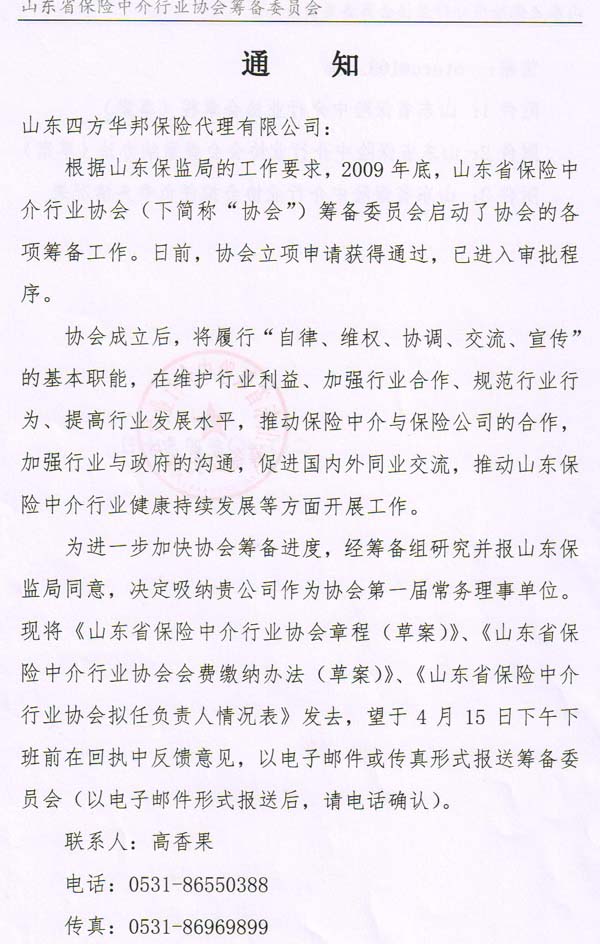 山東四方華邦保險(xiǎn)代理公司,從成立以來(lái)遵紀(jì)守法、合規(guī)經(jīng)營(yíng),取得了保險(xiǎn)監(jiān)管部門(mén)高度的認(rèn)可和信任。2009年底,山東省保險(xiǎn)中介行業(yè)協(xié)會(huì)籌備委員會(huì)啟動(dòng)了協(xié)會(huì)的各項(xiàng)籌備工作。日前,協(xié)會(huì)立項(xiàng)申請(qǐng)獲得通過(guò),已進(jìn)入審批程序。