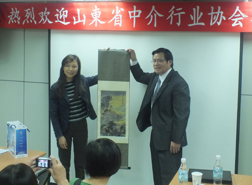 山東保監(jiān)局中介處付處長董榮女士與臺灣定律保險(xiǎn)代理公司董事長合影