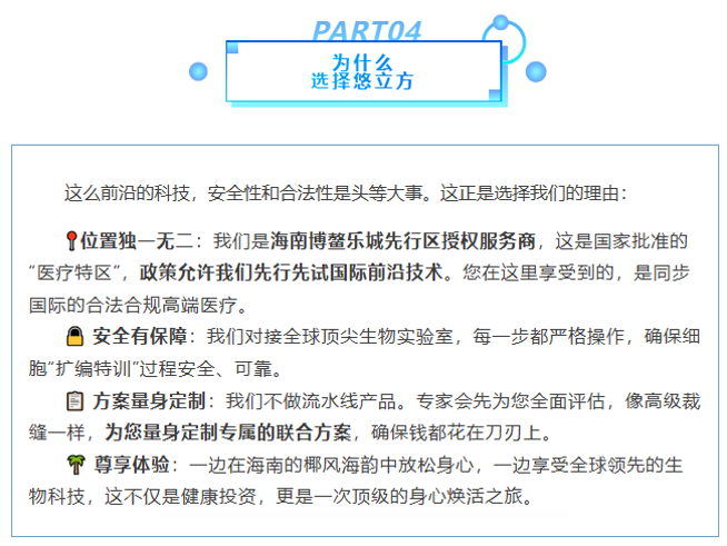 別急,今天就來海南博鰲樂城,揭秘一種讓高端人群紛紛“種草”的黑科技組合拳——“細胞超能充電寶”(NAD+) + “免疫特種部隊”(NK細胞)回輸?,F(xiàn)在,不用遠赴海外,在悠立方就能體驗到!