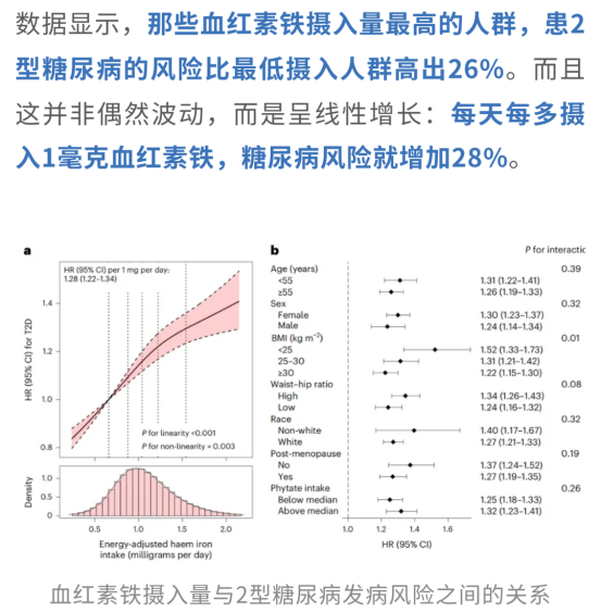 為了弄清楚血紅素鐵到底“背了多少鍋”,研究者還做了中介分析。結(jié)果發(fā)現(xiàn),在未加工紅肉引發(fā)的糖尿病風(fēng)險(xiǎn)中,有多達(dá)65.6%的部分可歸因于血紅素鐵的攝入。
