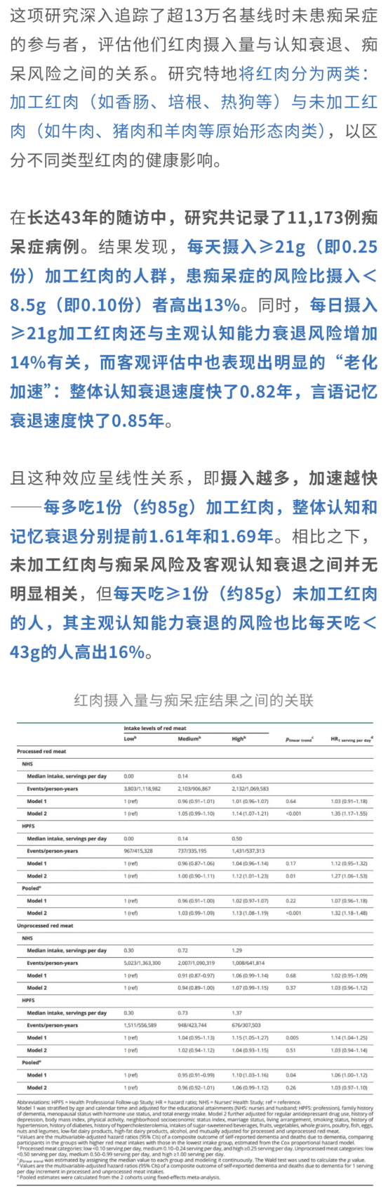 研究結(jié)果表明:每天攝入≥21g加工紅肉的參與者相比于攝入<8.5g的參與者,患癡呆的風(fēng)險(xiǎn)升高13%,主觀認(rèn)知衰退的風(fēng)險(xiǎn)增加14%。并且每增加1份(約85g)加工紅肉的攝入,整體認(rèn)知衰退和言語記憶衰退分別加速1.61年和1.69年。