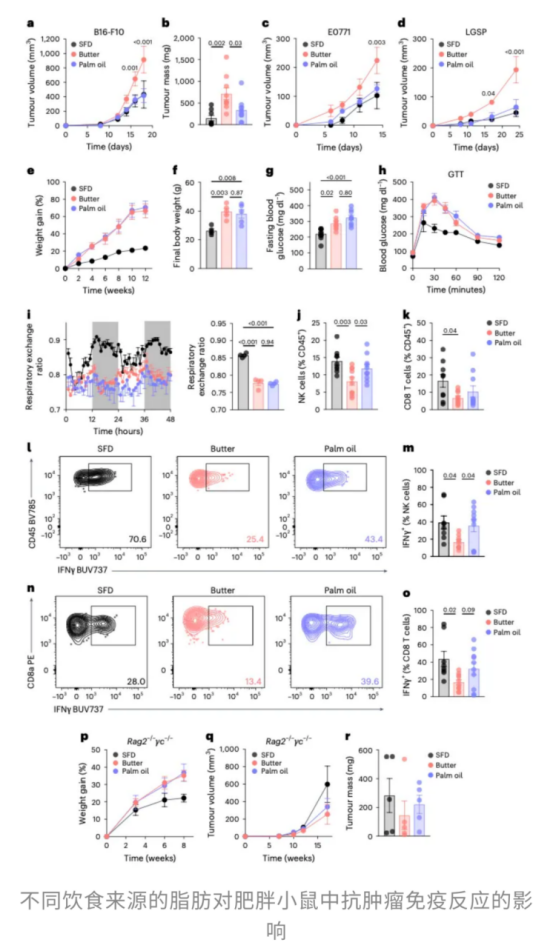 更令人警覺的是,來自哈佛大學(xué)的研究團(tuán)隊(duì)一項(xiàng)發(fā)表在Nature Metabolism的研究[1]進(jìn)一步揭示:肥胖并非“胖了就危險(xiǎn)”這么簡單,關(guān)鍵還在于——你是靠什么脂肪吃胖的。同樣是高脂飲食,用黃油吃出來的肥胖,和用棕櫚油吃出來的肥胖,對身體的影響天差地別。動(dòng)物脂肪(如黃油)可能通過誘導(dǎo)免疫細(xì)胞功能障礙來促進(jìn)腫瘤生長,而植物脂肪(如棕櫚油)則可能具有保護(hù)作用。