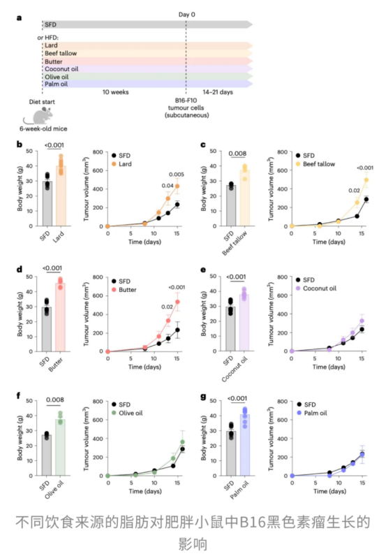 但真正的“分水嶺”出現(xiàn)在腫瘤模型實(shí)驗(yàn)之后。第10周,所有小鼠皮下注射黑色素瘤細(xì)胞(B16-F10),繼續(xù)維持原飲食直至實(shí)驗(yàn)終點(diǎn)。研究人員發(fā)現(xiàn),盡管各組小鼠體重相當(dāng),腫瘤的生長速度卻因脂肪來源的不同而顯著分化。與標(biāo)準(zhǔn)飼料組相比,豬油、牛脂和黃油組的腫瘤生長明顯加快;而椰子油、橄欖油和棕櫚油組的腫瘤生長速度則與對照組幾乎無異。