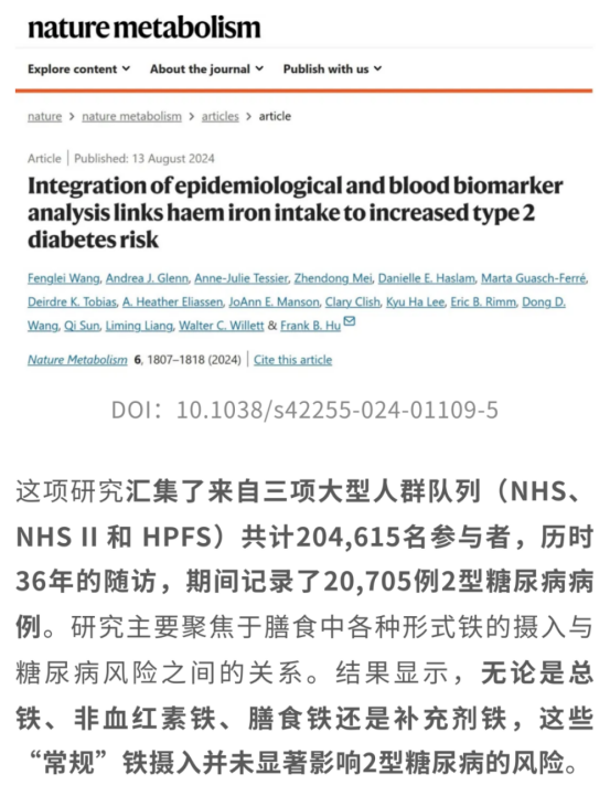 事實(shí)上,紅肉帶來的“副作用清單”遠(yuǎn)不止如此。除了認(rèn)知力受損、記憶力打折,紅肉中隱藏的“高危成分”還可能悄悄盯上我們的代謝系統(tǒng)。來自哈佛大學(xué)的研究團(tuán)隊(duì)另一項(xiàng)發(fā)表于Nature Metabolism的研究[3]表明,膳食中更高的血紅素鐵攝入量會(huì)導(dǎo)致罹患2型糖尿病的風(fēng)險(xiǎn)增加26%,尤其是紅肉來源的血紅素鐵。